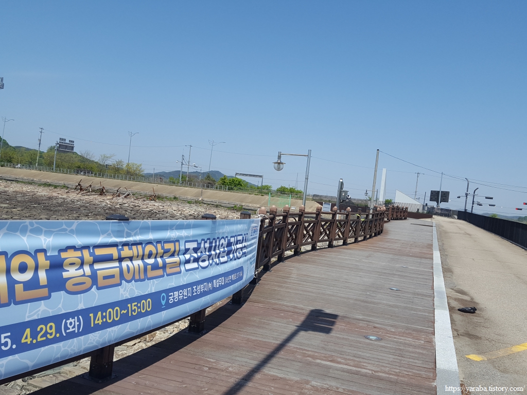 지금까지는 붉은색 계열의 순방향 서해랑길 화살표를 보면서 걸었는데 오늘은 파란색 계열의 역방향 화살표를 보면서 걷는다. 순방향에서는 잘 보지 못했던 역방향 화살표가 거꾸로 걸으니 이제는 잘 보인다. 길은 산업단지 외곽의 해안 산책로를 걷는다.