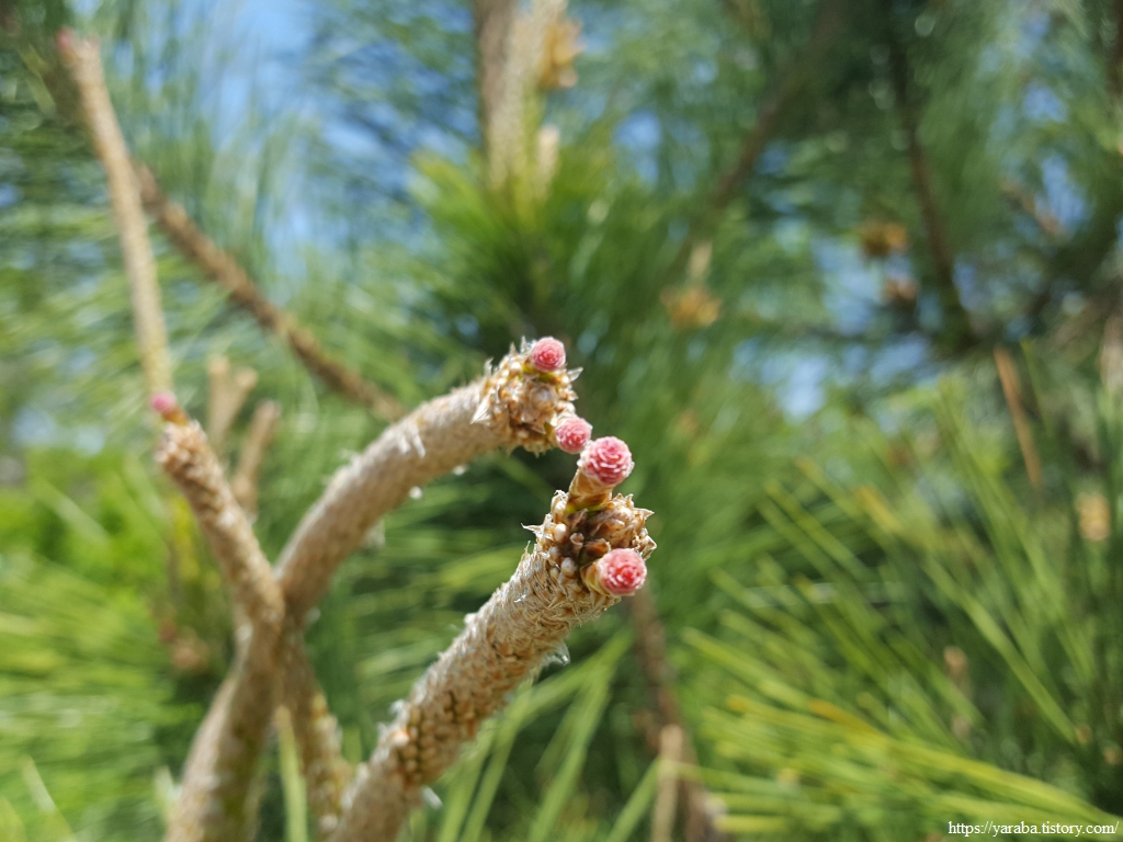 철쭉의 계절은 또한 송홧가루의 계절이기도 하다. 자세히 보니 늘 단색일 것만 같은 소나무의 꽃도 화려한 색을 가졌다. 수꽃과 암꽃이 함께 있는데 사진은 암꽃이다.