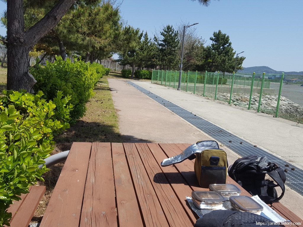 산업단지로 들어선 길은 해안 산책로로 진입한다. 공간은 산업단지 지역이지만 해안으로 좋은 산책로가 조성되어 있었다. 산책로 입구에 있는 벤치에서 조용하게 점심을 먹고 여정을 시작한다.