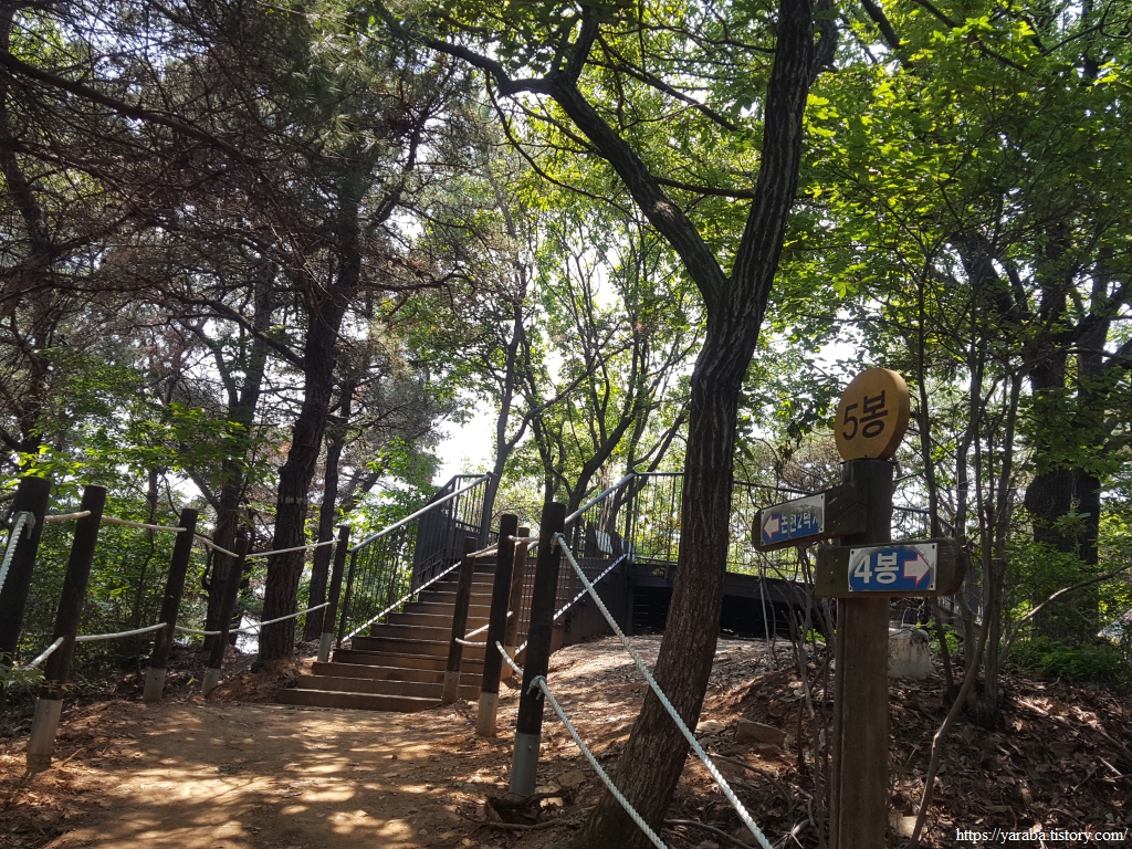 남동 둘레길을 걷는 사람들은 별 문제가 없지만 서해랑길을 걷는 사람들은 4봉을 지난 다음에는 경로를 잘 확인하면서 걸어야 한다. 서해랑길은 5봉으로 가지 않고 중간에 우측으로 빠져나가야 한다.
