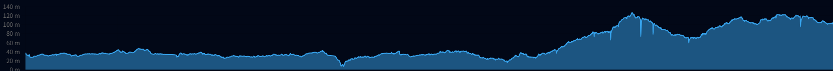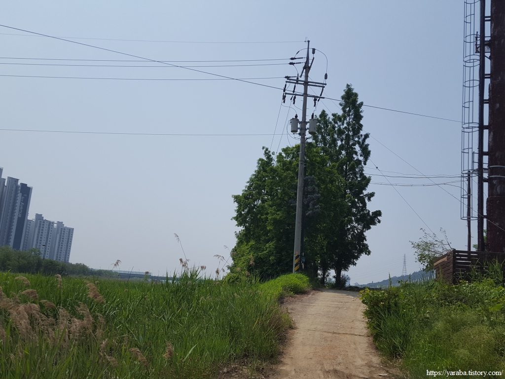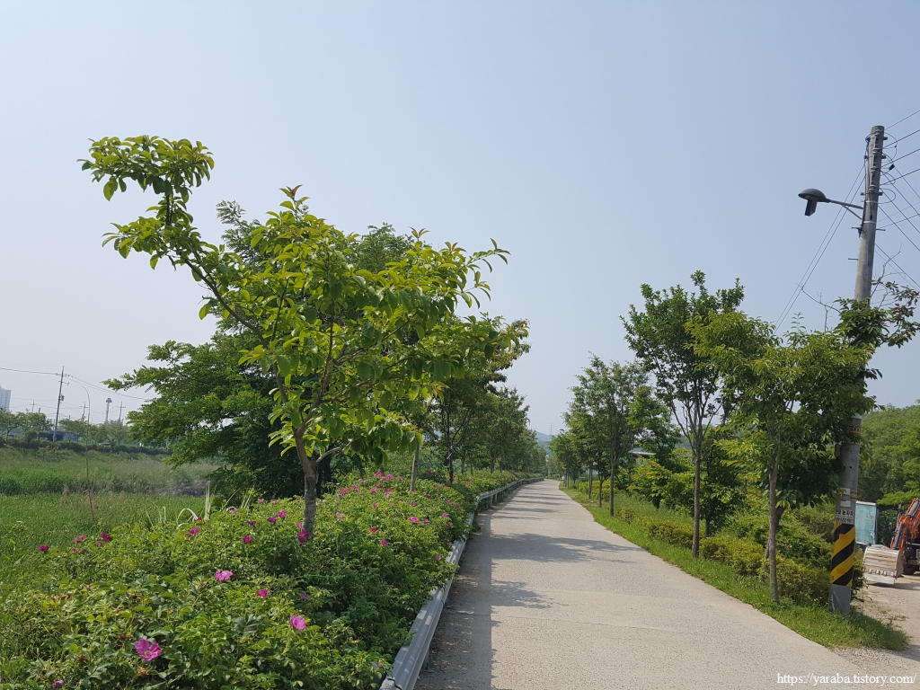 건너편 천변길도 해당화와 이팝나무가 줄지어 있는 깔끔한 산책로이다. 멀리 앞서 지나왔던 남동구 서창동의 아파트 단지들을 보면서 걸어 내려간다.