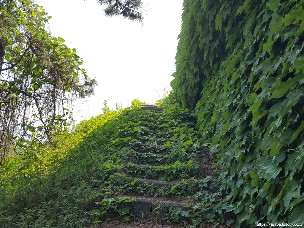 서쪽으로 오봉산을 향해 가는 길은 영동 고속도로 막고 있기 때문에 육교를 통해서 고속도로를 횡단해야 한다. 담쟁이가 뒤덮고 있는 다리의 계단을 오르니 비밀의 공간으로 들어가는 것 같은 뭔가 오묘한 기분이다.