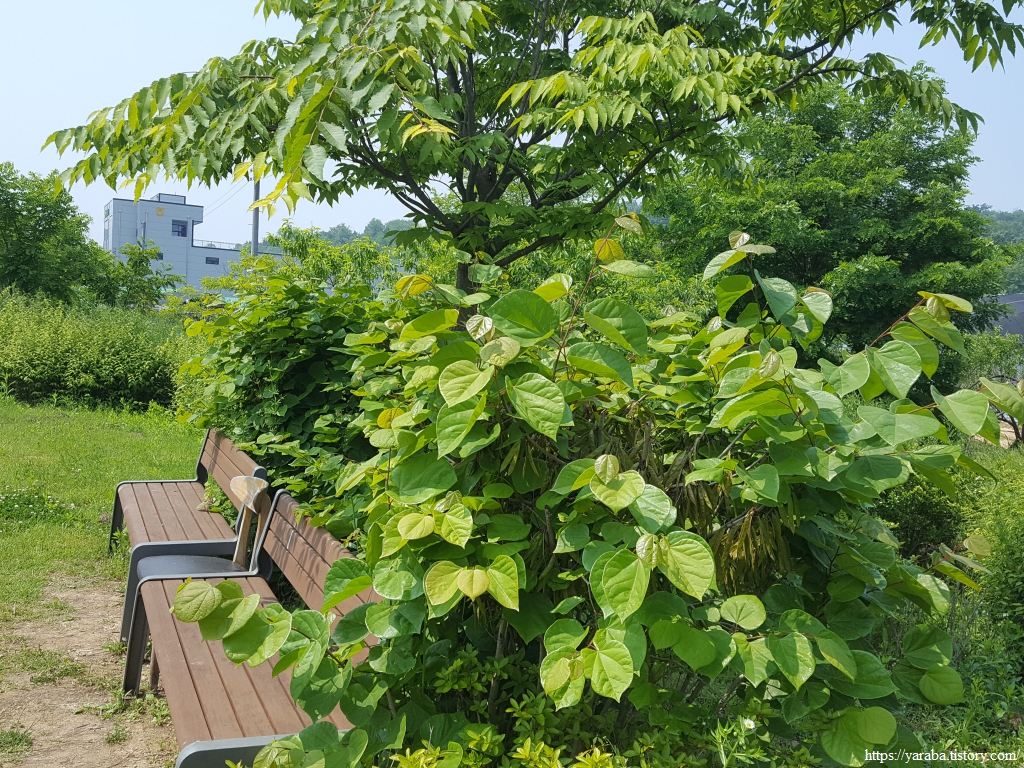 94코스 초입에 벤치가 있는 정자가 있어서 이른 점심을 먹으며 넉넉한 휴식 시간을 가질 수 있었다. 쉼터 주변으로 손바닥 크기의 하트 모양 잎을 가진 나무들이 있었는데 콩깍지 모양의 열매를 맺은 것이 이른 봄이면 화려한 분홍빛 꽃을 피우는 박태기나무였다. 분홍빛 꽃을 화려하게 피우는 봄이면 아직 잎이 거의 보이지 않을 때라 그런지 꽃을 있을 때와 없을 때가 전혀 다른 나무처럼 보인다. 콩과 식물답게 꼬투리로 열매를 맺고 있다.