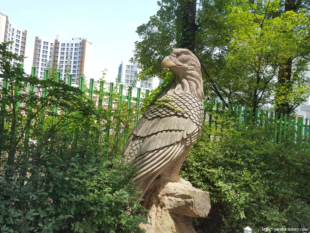 옥련 중학교 앞의 조형물들에 눈길이 갔는데 실감 나게 조각한 독수리 조형물은 아주 훌륭했다.