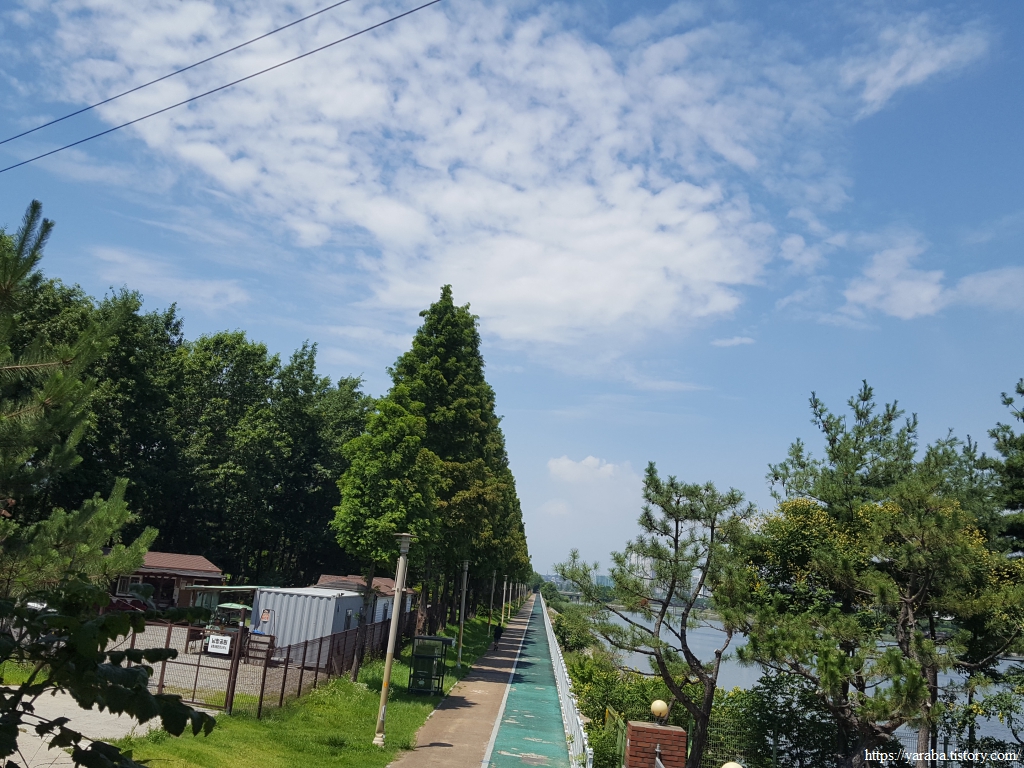메타세쿼이아 나무가 키가 커서 더 넓은 그늘을 제공할 것이라 생각했지만 실제로는 키가 작은 벚나무와 같은 활엽수들이 좋은 그늘을 만들어 주었다. 나무 그늘을 따라 이어지는 산책길을 묵묵히 걸어간다.