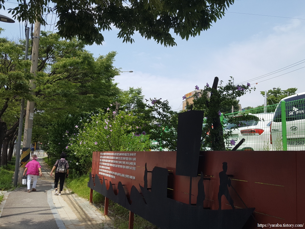 우산으로 햇빛을 가리며 걷다가도 가로수가 울창한 길을 만나면 정말 반가운 마음에 바로 우산을 접는다. 가로수 키가 크지 않더라도 인도 양쪽으로 심은 나무들은 해도 가려주고 이 길은 심지어 시원한 느낌으로 걸을 수 있다. 도심 속 나무 심기는 강조하고 또 강조해도 지나침이 없는 이야기라는 것을 몸으로 실감하고 있다. 옥련 중학교 앞을 지나는데 학교 울타리에 심은 나무들이 그늘 만들기에 합세하고 있다.