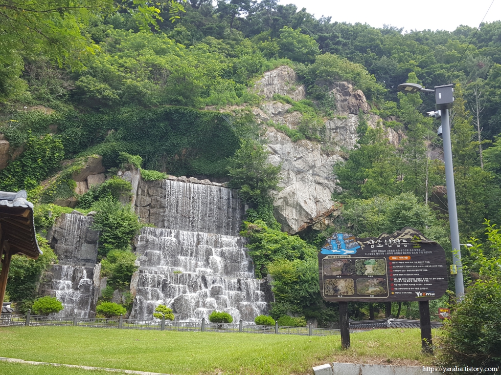 문학산에서 내려온 길은 자연스럽게 백제사신길과 연결되는데, 삼호현 전통숲은 백제 사신길과 연관성이 있다. 중국 사신길에 나서는 임을 세 번 불렀다고 해서 삼호현이라는 지명이 붙었다는 이야기가 있다. 인공 폭포의 물줄기가 눈에는 시원하게 보이지만 찌는 듯한 폭염에는 한계가 있다.