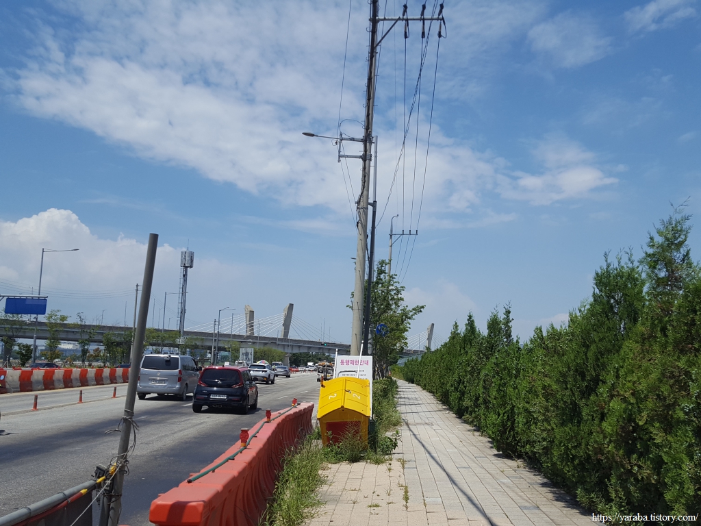 영종도, 인천대교와 이어지는 제2 경인고속도로의 고가도로 아래를 통과하여 해변길을 따라 북쪽으로 이동한다. 그늘 없는 뙤약볕 아래를 우산으로 가리며 길을 이어간다.