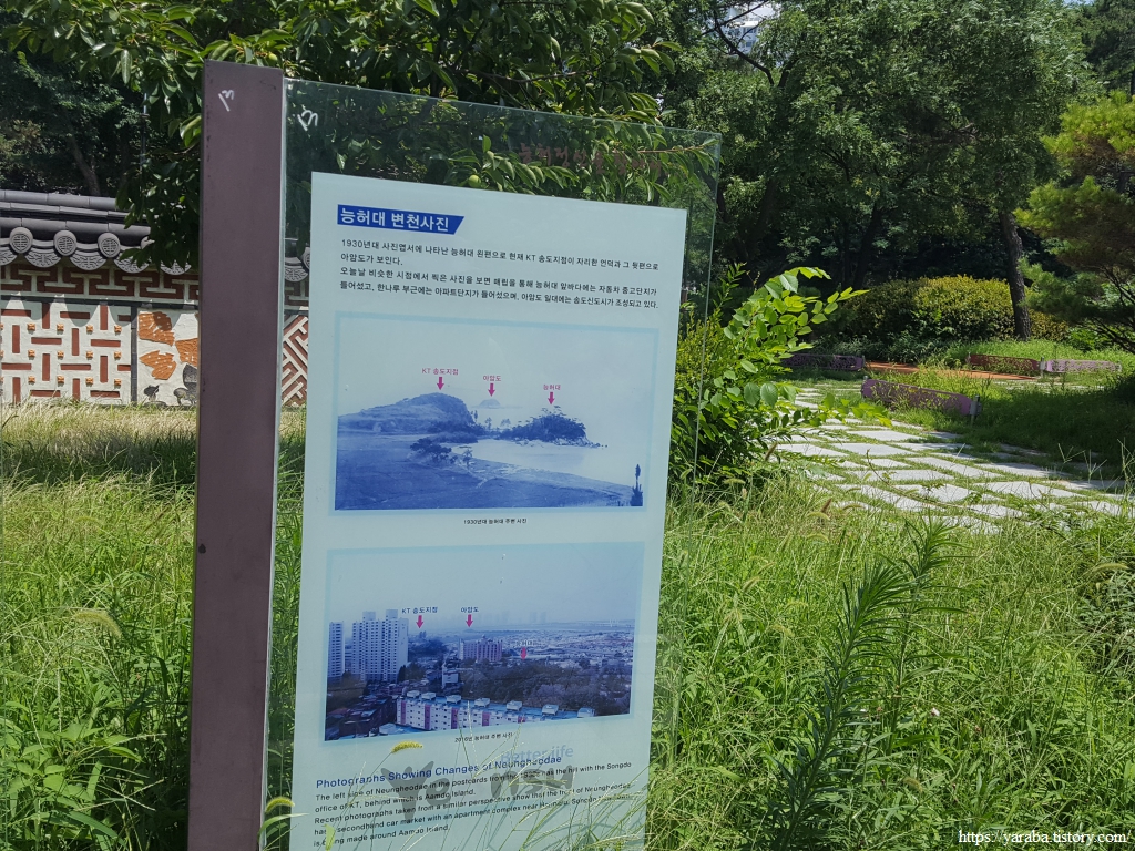 능허대는 근초고왕 때 이후로 백제의 사신들이 중국으로 가는 배를 탔던 곳이라고 한다. 1930년대의 비교 사진을 보면 이곳 주위로는 온통 바다였지만 지금은 아파트 단지와 송도신도시로 옛날의 흔적은 찾아볼 수 없다.