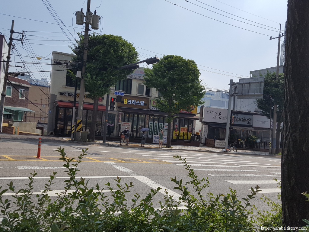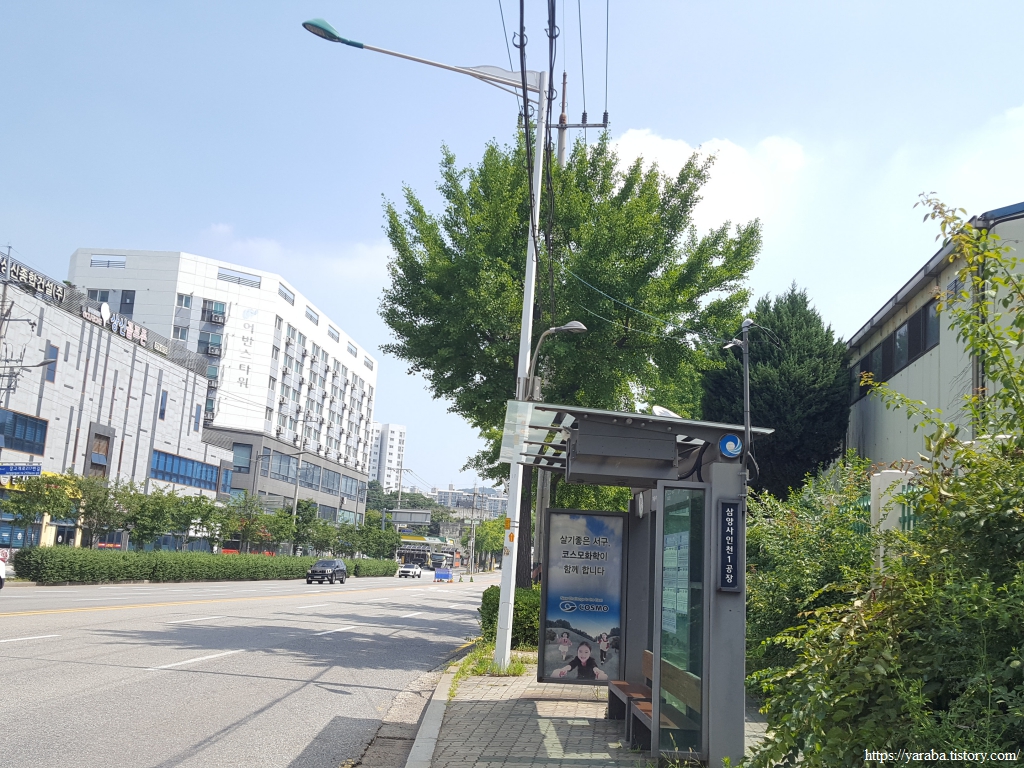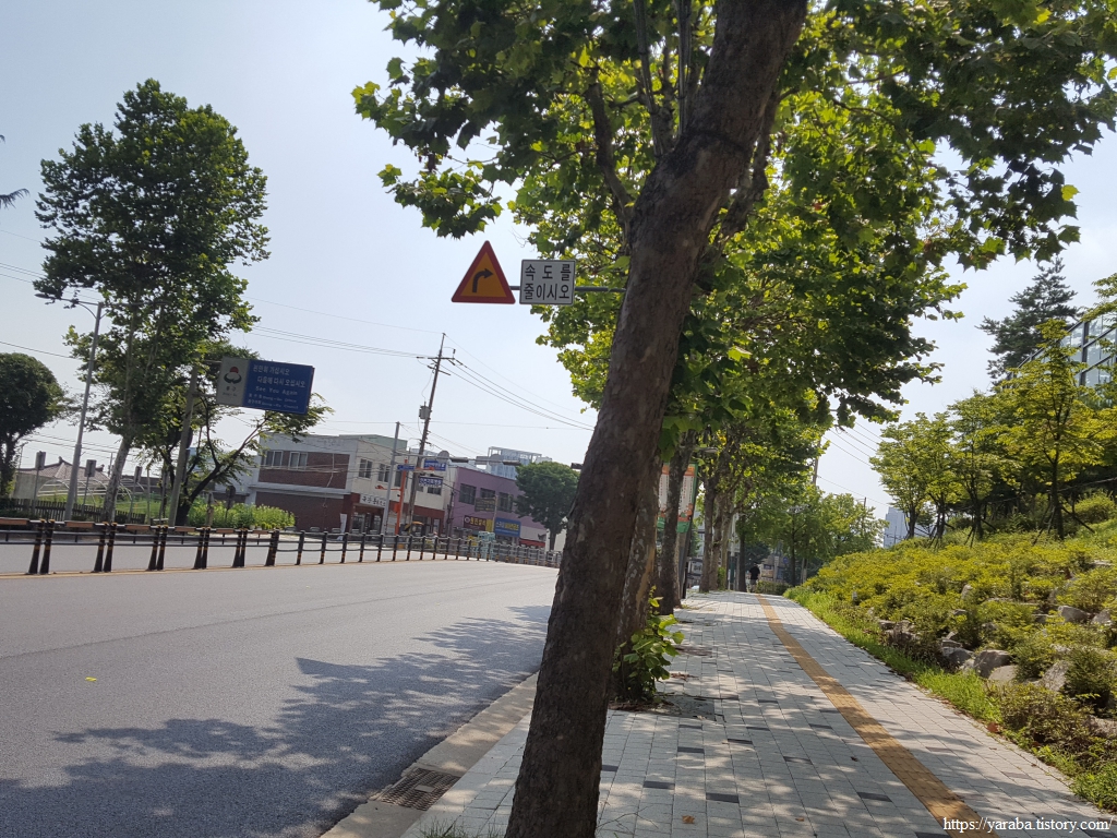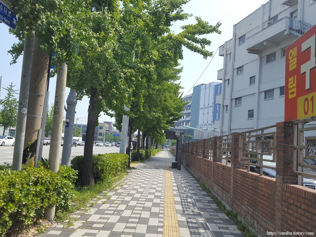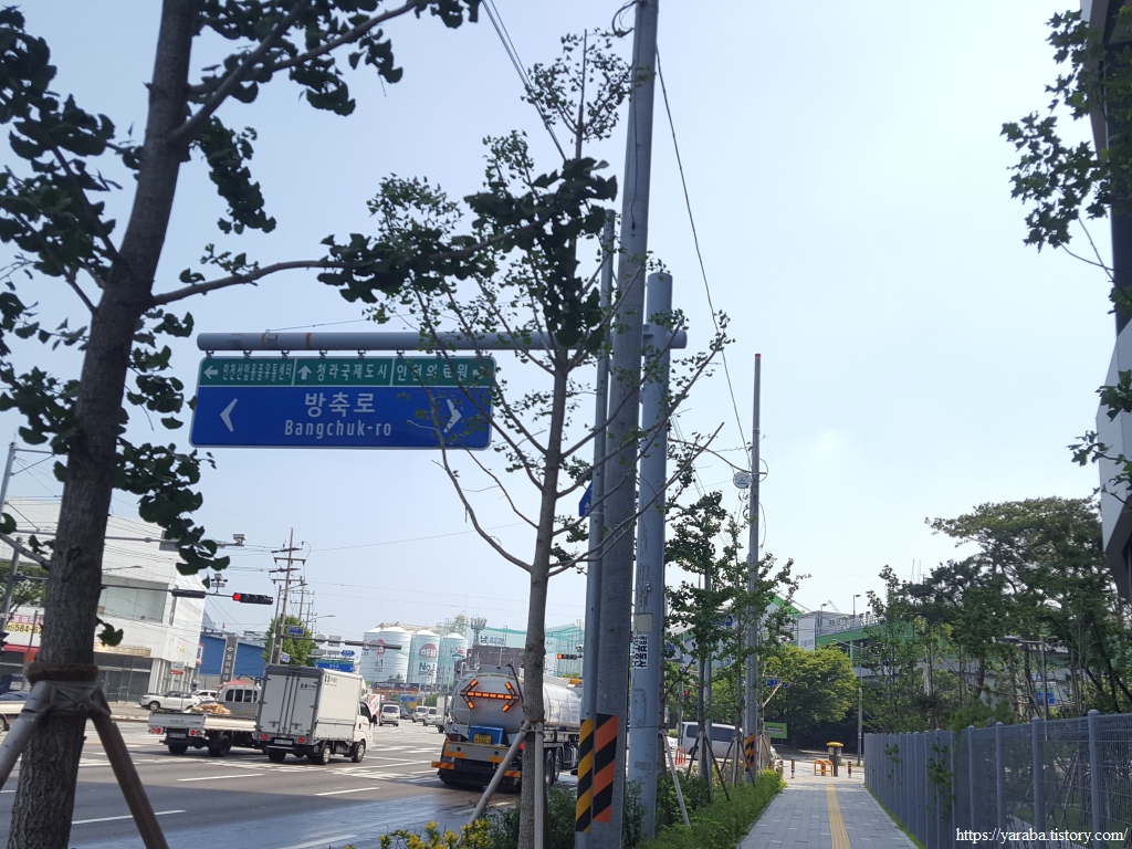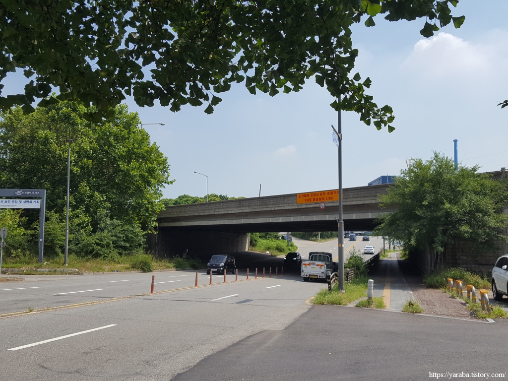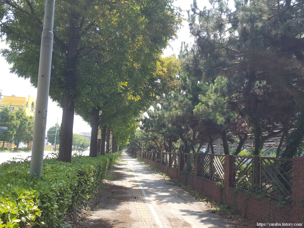 폭염 속에서 산업단지 지역을 걷지만 오히려 키가 큰 가로수 덕분에 나무 그늘 아래에서 걸을 수 있어서 좋았다. 철강 공장 울타리에 심은 나무 덕분에 지금 우리가 산업단지를 가로지르고 있는지, 철강 공장 바로 옆을 지나고 있는지 느끼지 못할 정도이다. 인천 동구에서 인천 서구로 진입한다.