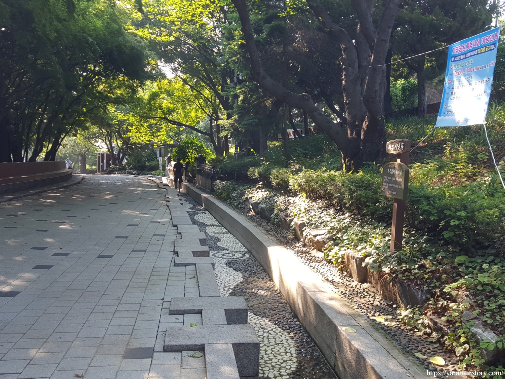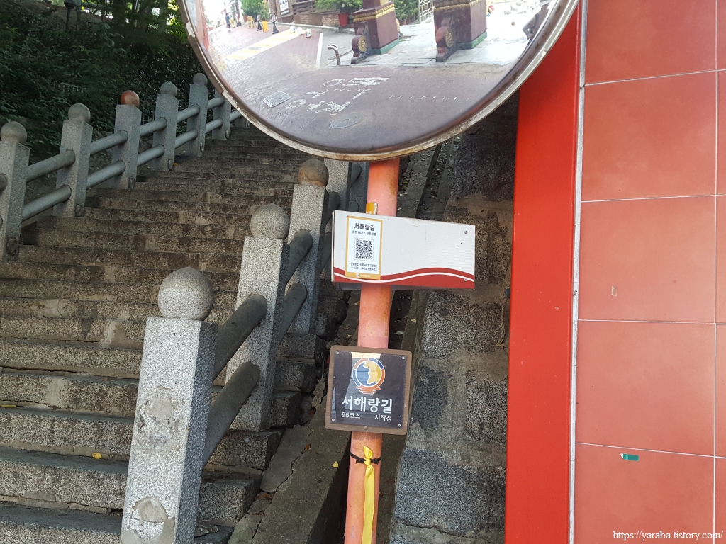 서해랑길 96코스는 별도의 안내판은 없고 소박한 시작점 안내 표식으로 시작한다. 아마도 주변이 삼국지 벽화 거리, 초한지 벽화 거리이다 보니 그 기세에 눌린 것이 아닌가 싶다. 아무튼 계단을 통해서 자유 공원을 오르는 것으로 코스를 시작한다.