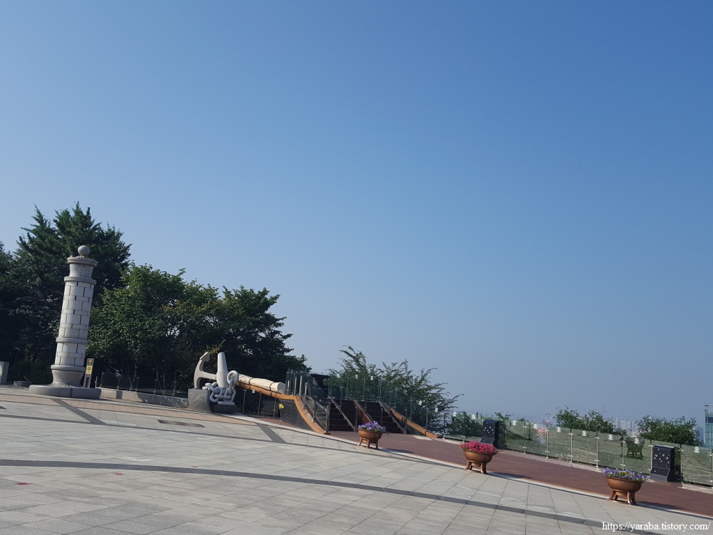 이른 아침에 출발했지만 워낙 날씨가 덥고 습해서 그런지 나무 숲 속에서 있어도 후텁지근한 분위기가 가시지 않는다. 다행인 것은 자유 공원의 공중 화장실을 다녀왔는데 에어컨 빵빵하게 가동하고 있어서 잠시 숨을 돌릴 수 있는 장소 역할을 해주었다. 숲 속에서도 시원하지 않으니 잠시 숨을 돌리고 바로 여정을 이어간다. 탁 트인 광장 끝자락, 등대와 닻 조형물이 있는 전망대에서 잠시 주위를 둘러본다.