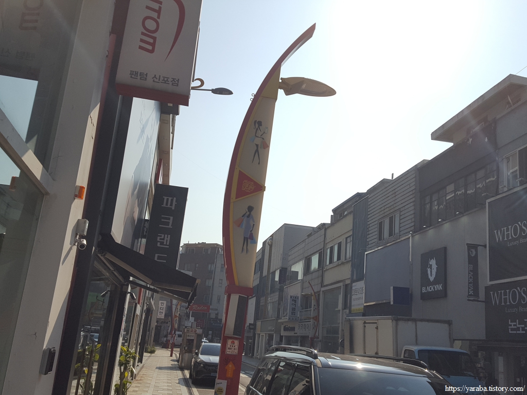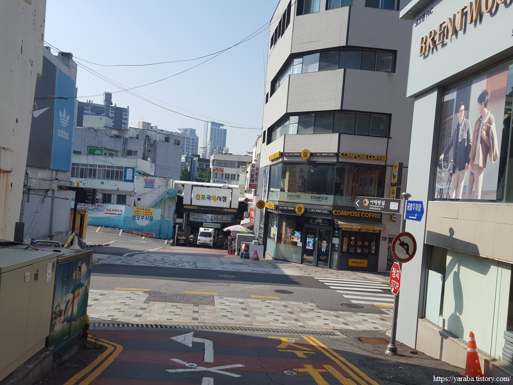 길은 어제 우리가 하룻밤 쉬어 갔던 신포 문화의 거리를 거쳐서 간다. 어제 다녀왔던 신포 국제 시장도 지난다.