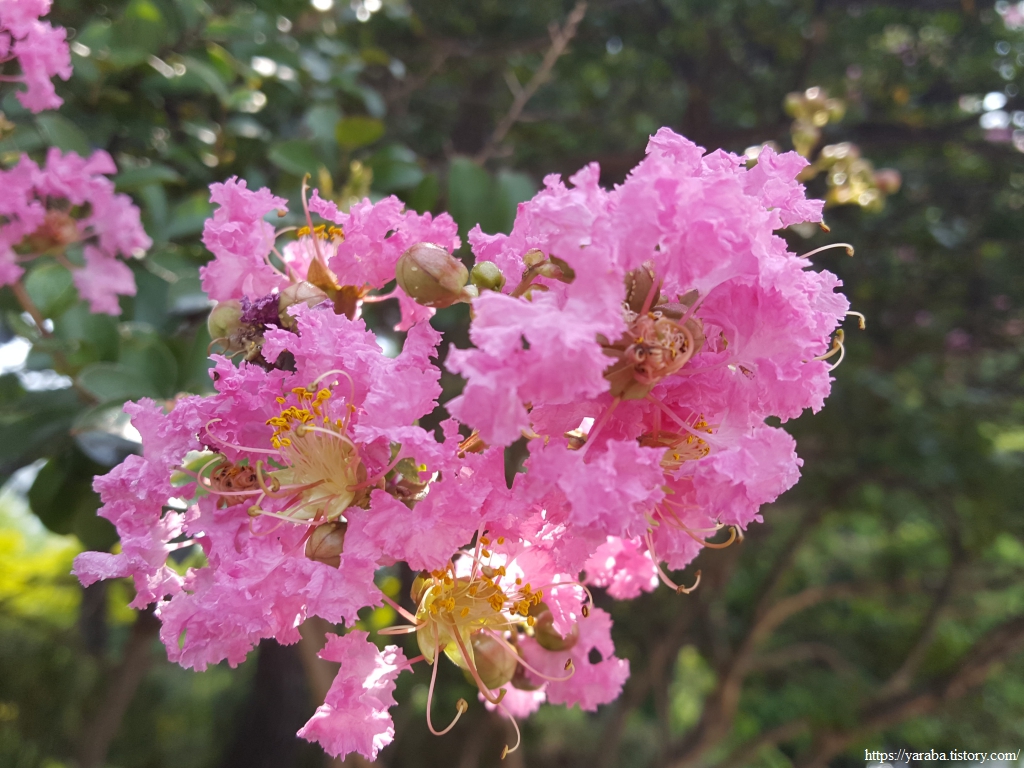 7월부터 가을까지 핀다는 배롱나무의 분홍꽃도 폭염에 지쳐 보인다.