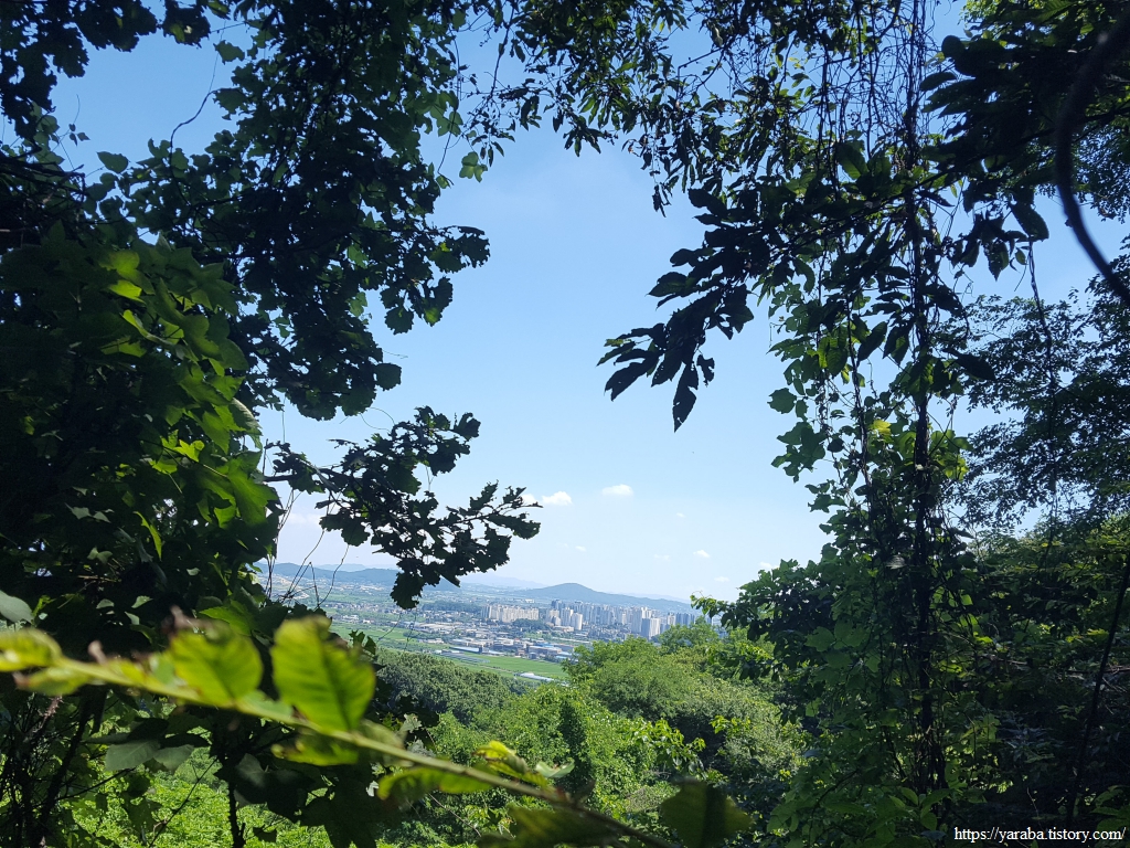 산을 얼마간 오르면 이제는 산행이 아니라 임도를 따라서 완만한 길을 걷게 된다. 북쪽으로는 숲 너머로 김포 한강 신도시의 아파트 숲이 시야에 들어온다.