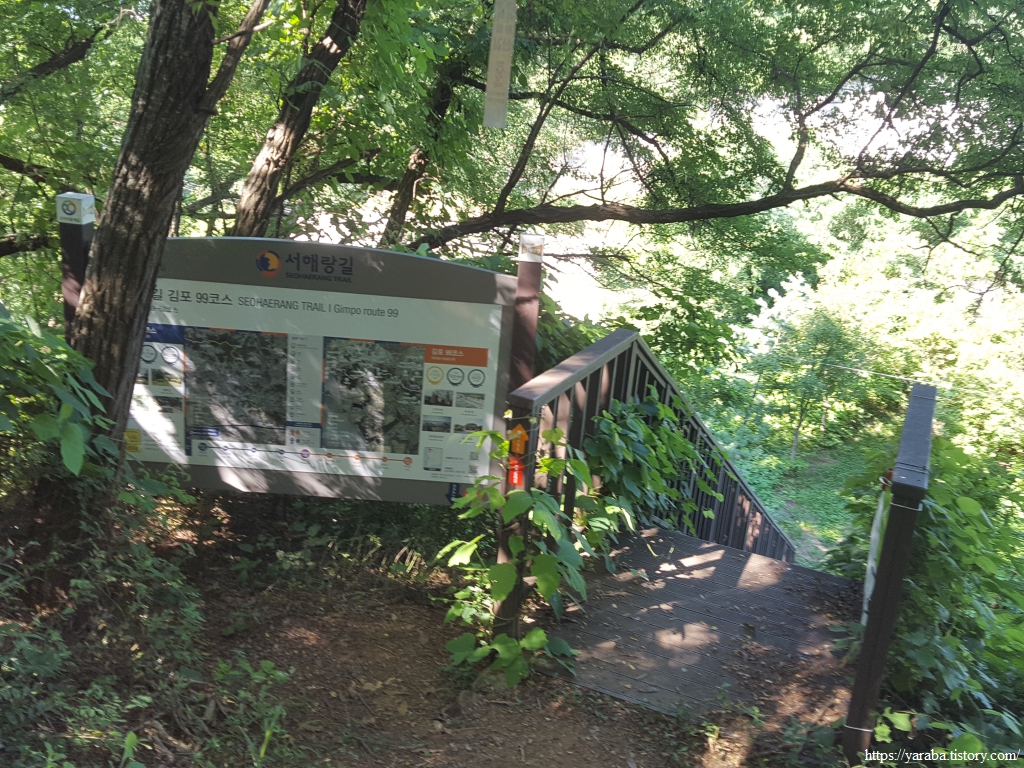 인천시에서 김포시로 넘어온 서해랑길은 봉수대로 위의 생태통로에서 시작하여 학운산과 승마산 자락을 걷는다. 김포시 양촌면에서 대곶면으로 넘어가는 길이다. 산을 내려오면 대곶면의 공단 지대를 가로지르고 수도권 제2 순환 고속도로를 지나서 고속도로 옆길을 따라 올라가며 수안산을 오르기 시작한다.