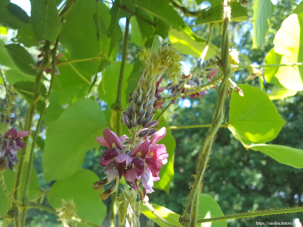경사가 있는 산행길을 걷는 것보다는 임도 걷기가 역시 수월하다. 강렬한 태양 아래에서도 길옆의 꽃을 보며 걸을 수 있는 여유가 있다. 여름꽃인 칡꽃이 절정인 시기가 맞는 모양이다. 짙은 붉은색의 칡꽃이 스페인 무희가 입는 화려한 의상을 연상시킨다.