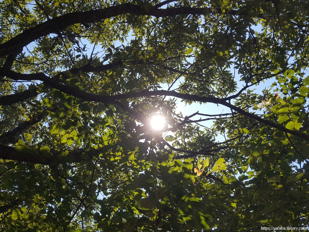아무도 찾지 않는 임도 벤치에 누워서 잠시 쉬어 가기로 했다. 나무 그늘이기는 하지만 머리 위로 나뭇잎 사이 태양이 보이는 것을 보면 이곳에서 태양을 완벽하게 피할 수는 없는 모양이다.