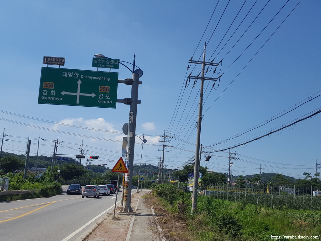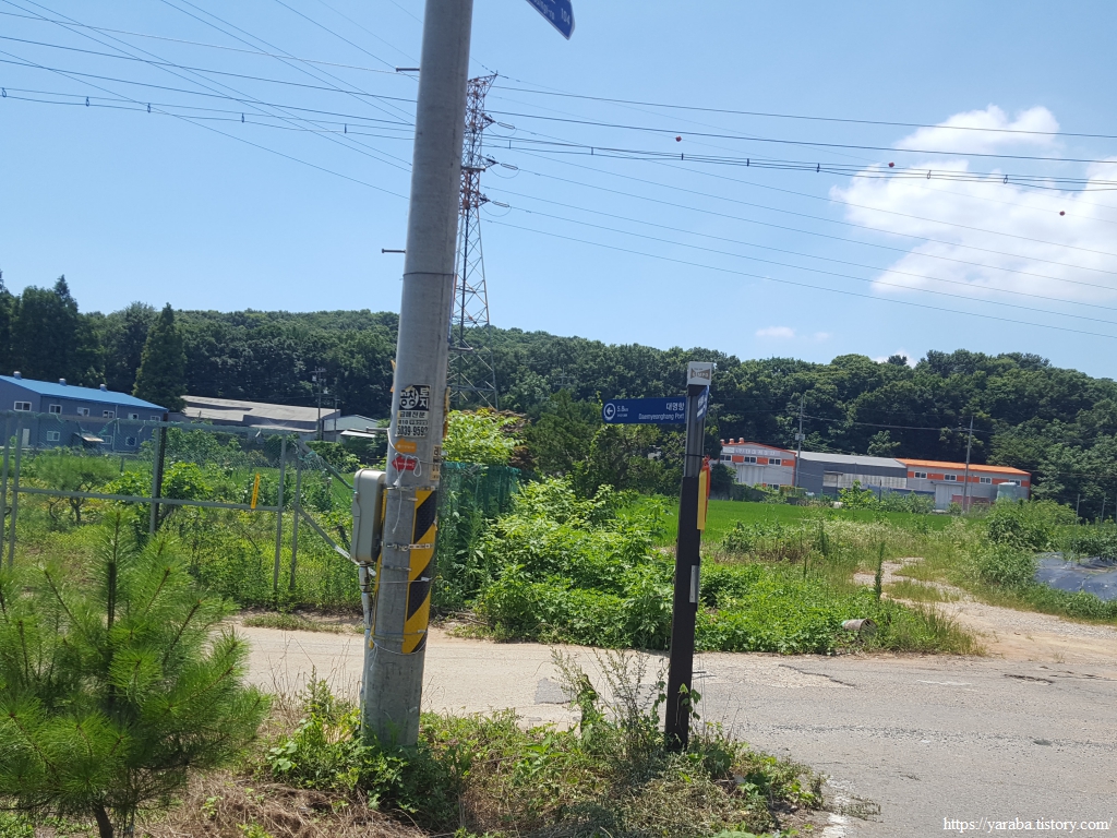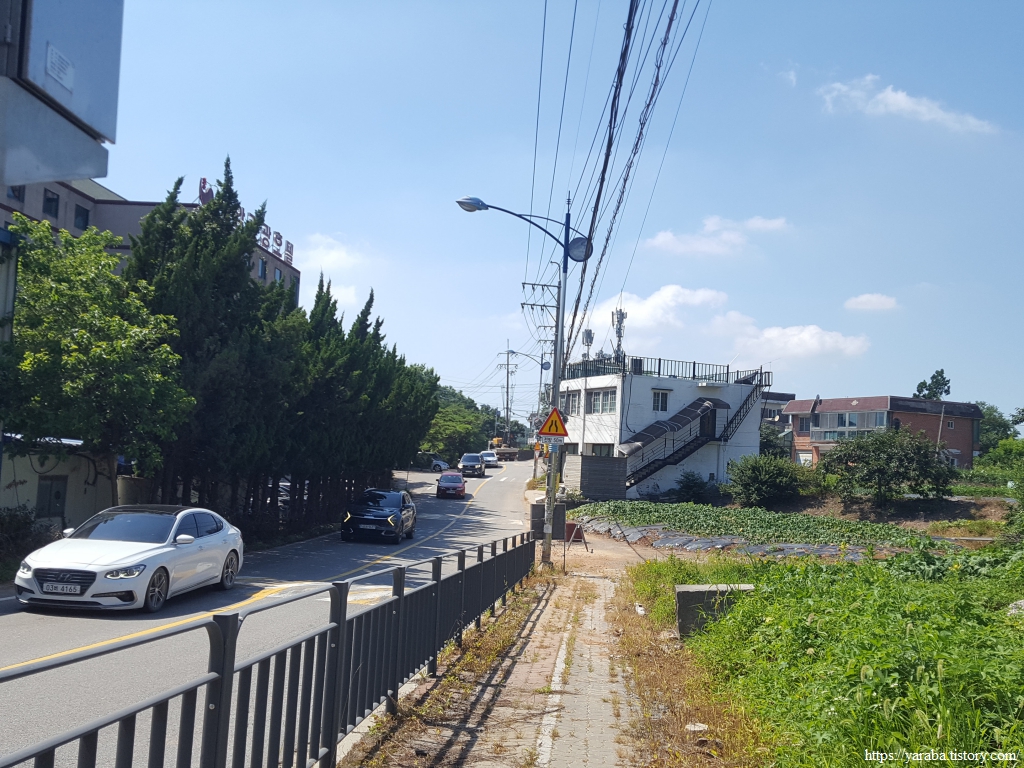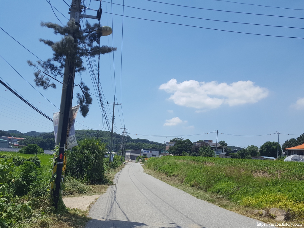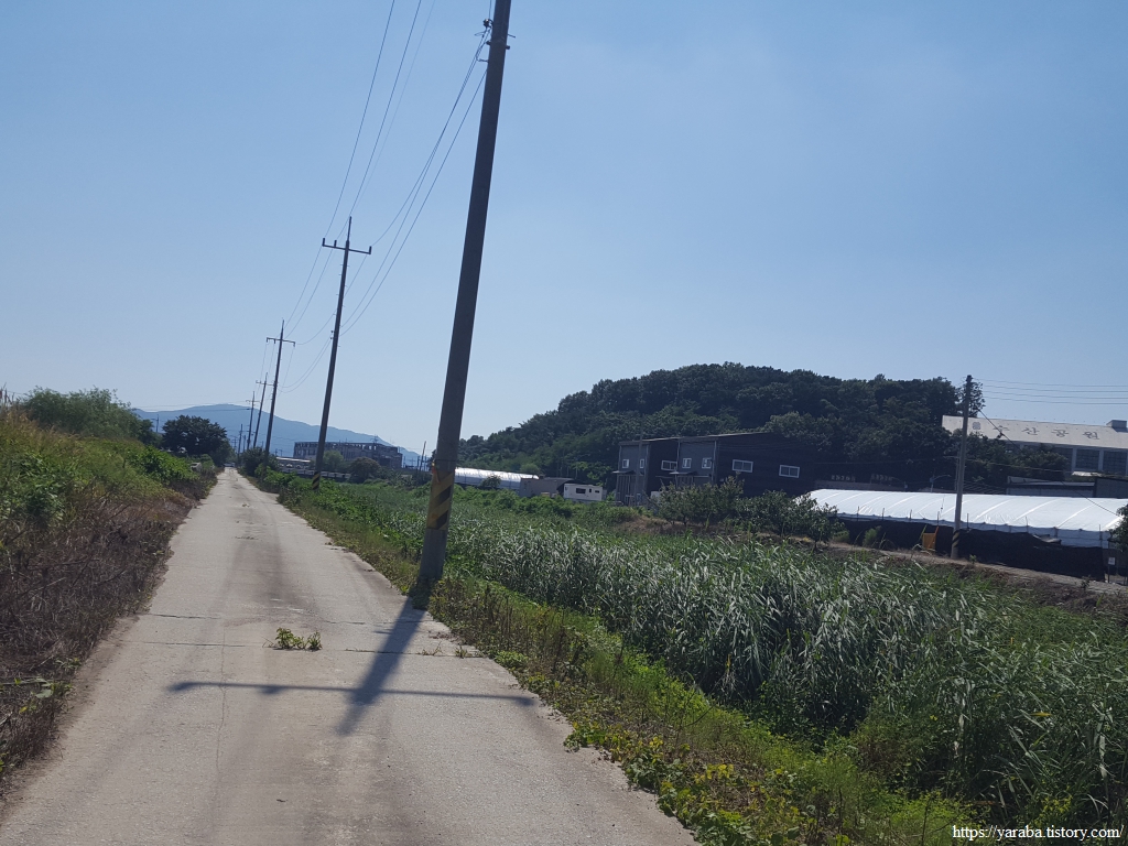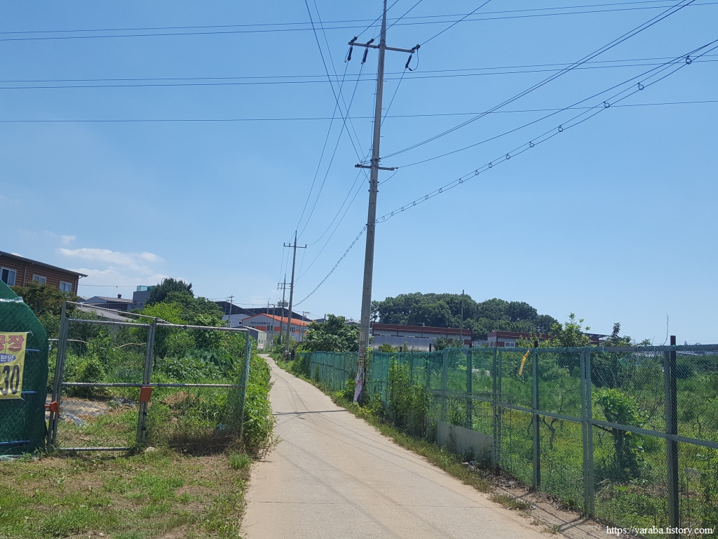 공장과 농지가 공존하는 상마리 마을길을 가로지르는 지점, 대명항까지 약 6Km 정도 남았다.
