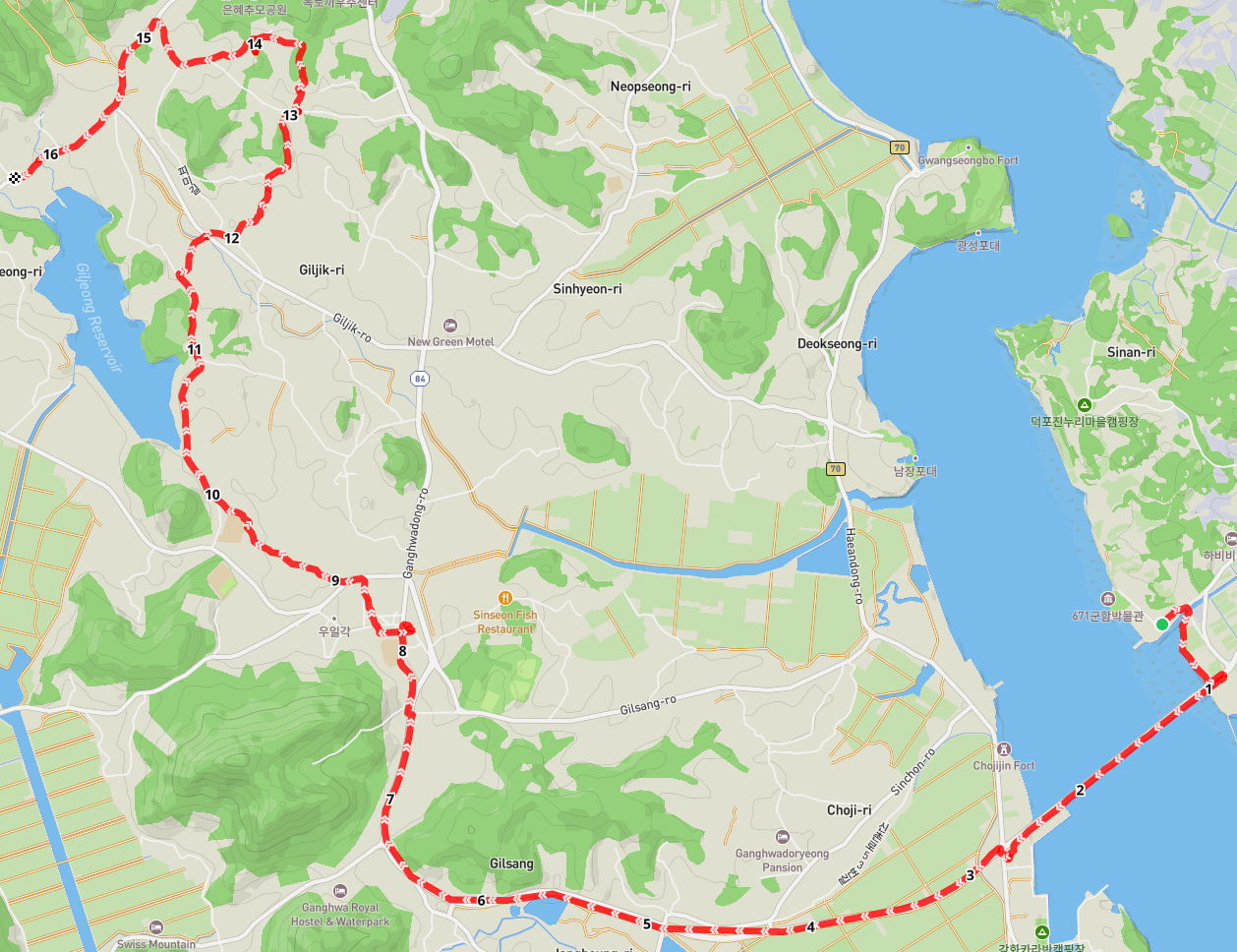 초지대교를 넘어온 길은 강화군의 다양한 길 안내를 한꺼번에 맞이한다. 정면으로 직진하면 전등사이고 사거리에서 우측으로 가면 초지진, 좌측으로 가면 선두항이다. 이곳에서 하룻밤 쉬어간다.
