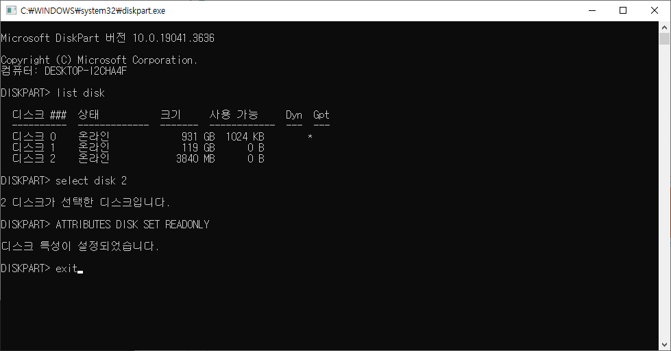 CD-ROM이 있다면 간단히 해결될 일이지만 USB 스틱에 쓰기 금지를 설정하는 작업이 그리 녹록지 않았다. 일부 제품에는 SD 카드처럼 쓰기 방지 스위치가 있어서 Lock 위치로 스위치를 옮겨 놓으면 쓰기 방지를 간단히 수행할 수 있다. 이러한 Lock 스위치가 없는 경우에는 소프트웨어적인 방법을 적용해야 하는데 첫 번째 방법은 위의 그림처럼 윈도우에 내장된 diskpart 프로그램으로 드라이브에 읽기 전용 속성을 설정하는 것이다. 이 방법을 사용하면 내 컴퓨터에서는 USB 메모리에 대한 읽기 전용 속성이 잘 동작하지만 다른 컴퓨터에서는 동작하지 않는 문제점이 있다.