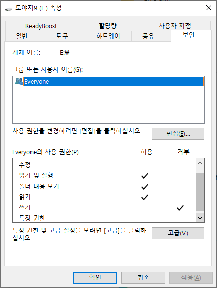 NTFS 파일 형식으로 포맷을 했으면 위의 그림처럼 드라이브 속성> 보안 탭에서 Everyone 사용자의 사용 권한 [편집] 버튼을 눌러서 쓰기 권한을 거부로 설정하고 적용하면 다른 컴튜터에서도 USB 메모리에 대한 읽기 전용 속성을 그대로 유지할 수 있다.