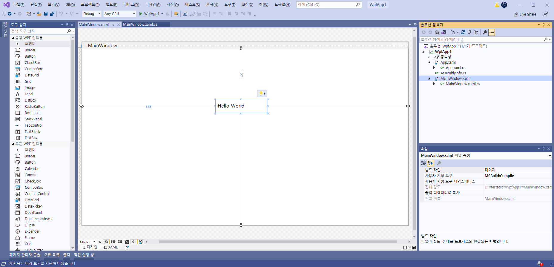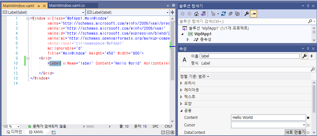 프로젝트가 생성되면 위의 그림처럼 App.xaml과 MainWindow.xaml을 생성하는데 각 xaml과 *. cs가 짝으로 이루어져 있는 것을 확인할 수 있다. 이 상태에서 좌측 도구 상자에서 레이블을 하나 끌어다 놓고 Content를 "Hello World"로 입력한 다음 F5를 눌러서 프로그램을 빌드하고 실행한다.