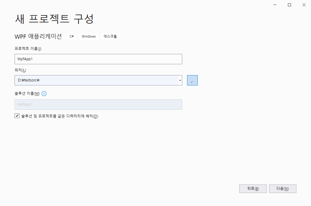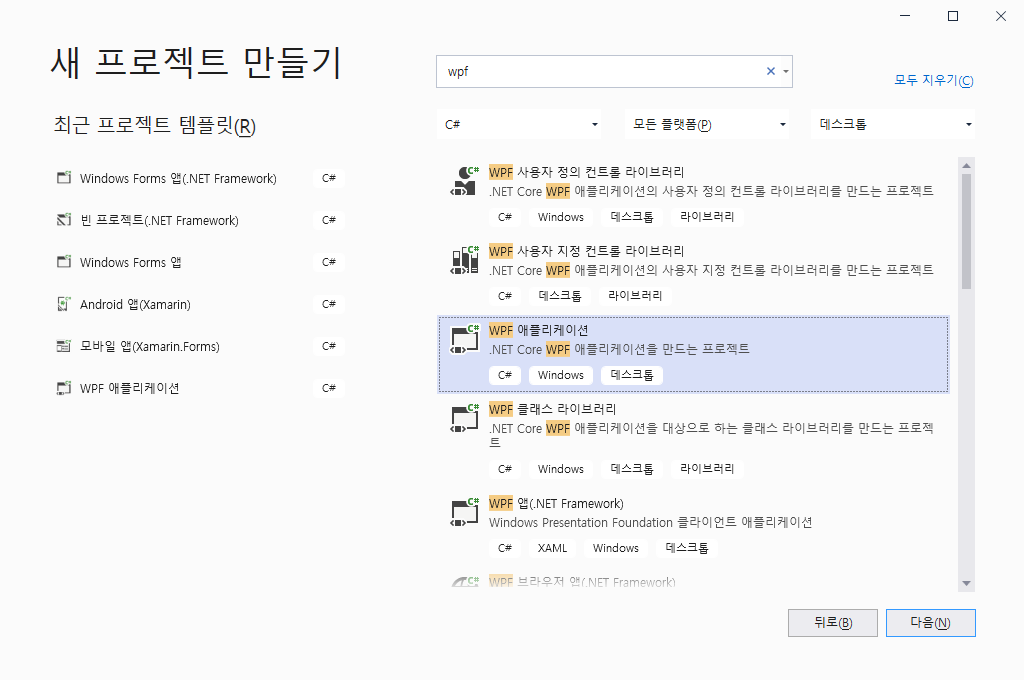 [새 프로젝트 만들기]를 선택하고 위의 그림처럼 템플릿 검색창에 wpf를 입력하면 연관된 다양한 템플릿을 만날 수 있는데 C# 기반의 닷넷 코어를 사용하는 템플릿을 선택하고 [다음]을 누른다.