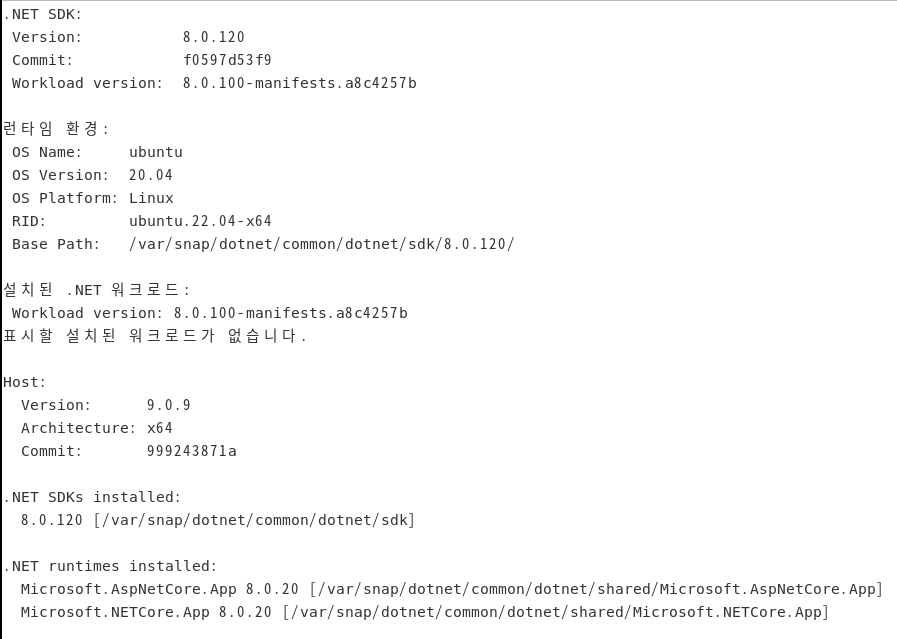 위의 그림은 우분투에서 "dotnet --info" 명령을 수행한 결과이다. SDK나 런타임 설치 내역만 조회하려면 다음의 명령을 사용한다.