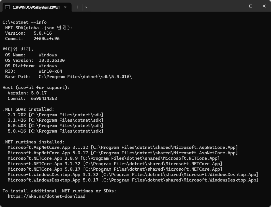 윈도우+r 단축키로 실행창에서 cmd를 구동시켜서 "dotnet --info" 명령을 수행하면 위의 그림처럼 설치된 SDK와 런타임을 한 번에 확인할 수 있다. 리눅스에서는 콘솔창에서 해당 명령을 수행하면 된다.