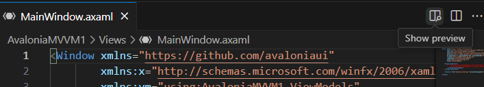 *. axaml를 선택했는데도 미리 보기가 나오지 않으면 빌드했는지 확인하고 위의 그림처럼 편집창 우측 상단의 [Show preview] 아이콘을 클릭한다.