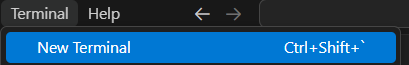 Terminal > New Terminal 메뉴를 선택하거나 Ctrl+Shift+` 단축키로(숫자 1 좌측 특수문자) 새 터미널을 연다.