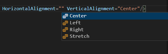 VS Code의 아발로니아 확장을 통해서 얻을 수 있는 또 다른 유익은 위의 그림과 같은 자동 완성 기능이다. 위의 그림은 수평 정렬 항목 값이 입력되지 않은 상태에서 Ctrl+Enter 키를 눌러서 제공받은 화면이다.