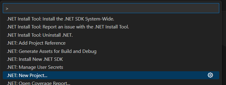 View > Command Palette 메뉴를 선택하거나 Ctrl+Shift+P 단축키로 명령 팔레트를 열고 ".NET: New Project"를 선택한다.