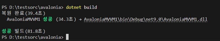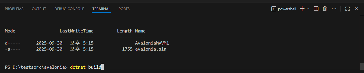 화면 하단에 PowerShell 기반의 터미널 창이 나오는데 이때 *.sln이 있는 프로젝트 폴더 위치를 확인하고 위의 그림과 같이 "dotnet build" 명령으로 빌드를 수행한다.