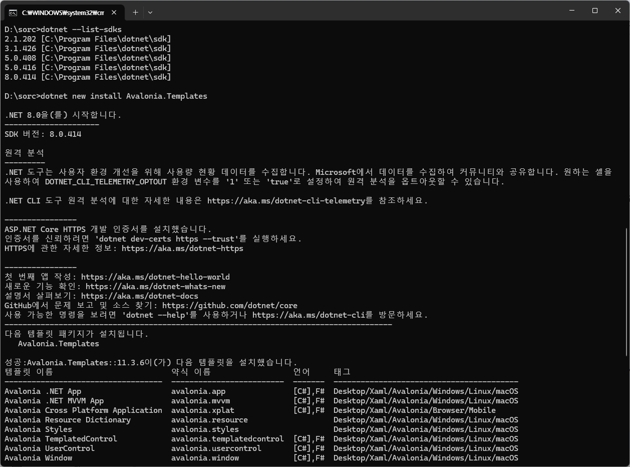 닷넷 SDK는 위의 그림처럼 명령창을 열어서 "dotnet --list-sdks"로 간단히 확인할 수 있으며("설치된 닷넷 SDK와 닷넷 런타임을 확인하기" 참조), 아발로니아 프로젝트 템플릿도 "dotnet new install Avalonia.Templates" 명령으로 간편하게 설치할 수 있다. 설치 결과를 보면 많이 사용하는 "Avalonia .NET App", "Avalonia .NET MVVM App" 템플릿 이외에도 여러 템플릿이 있음을 확인할 수 있다. 닷넷 SDK 버전은 "Avalonia for VSCode"가 9.0을 요구하고 있으므로 이를 설치한다.