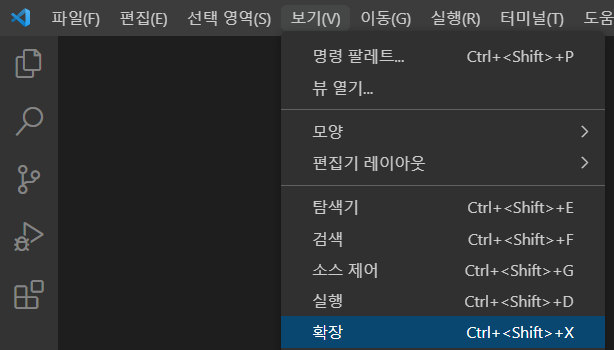 VS Code를 열고 보기 > 확장 메뉴를 선택하거나 Ctrl+Shift+X 단축키를 사용하여 확장 탭을 연다. 주의할 점은 오래된 VS Code라면 업데이트를 확인하여 최신버전으로 교체하고 수행한다.