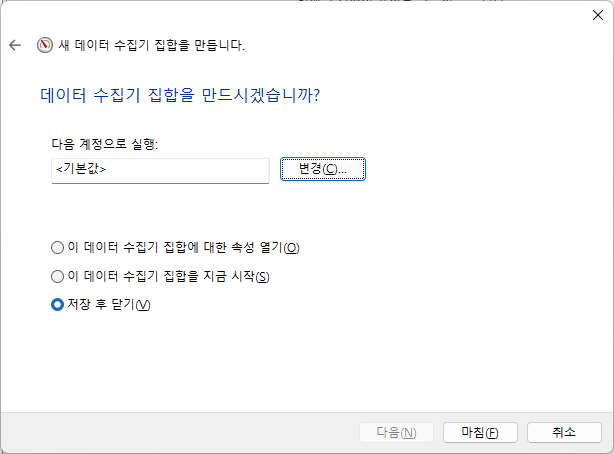 작성한 데이터 수집기 집합에 대하여 "저장 후 닫기"를 선택하고 [마침]을 누른다.