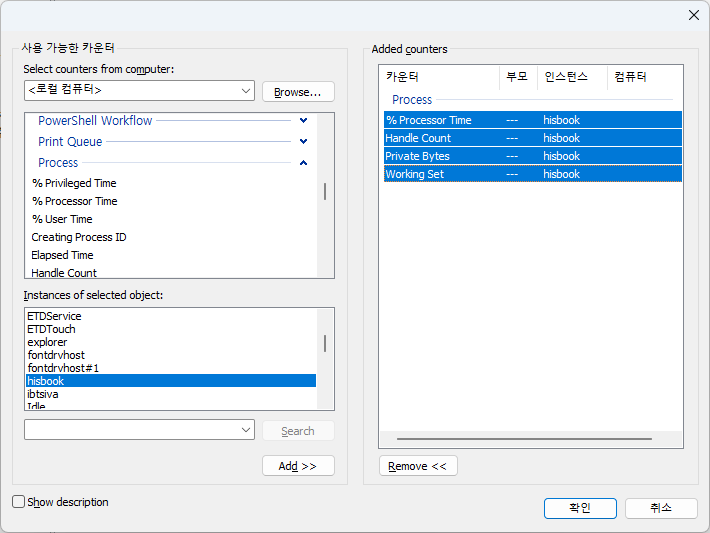 카운터 선택 대화창에서 좌측 상단의 "Process" 섹션을 열고 원하는 모니터링 항목을 선택하고, 좌측 하단에서 모니터링하려는 프로세스를 선택한 다음에 하단의 [Add>>] 버튼을 클릭하여 항목을 추가한다. 이와 같은 방식으로 모니터링하려는 항목들을 반복적으로 추가해도 되고 우측 상단의 모니터링 대상을 Ctrl키나 Shift키로 다중 선택하여 한번에 추가할 수도 있다. 필자의 경우 프로그램의 메모리, CPU, 핸들을 모니터링하도록 설정했다. [확인] 버튼으로 원래 화면으로 돌아간다.