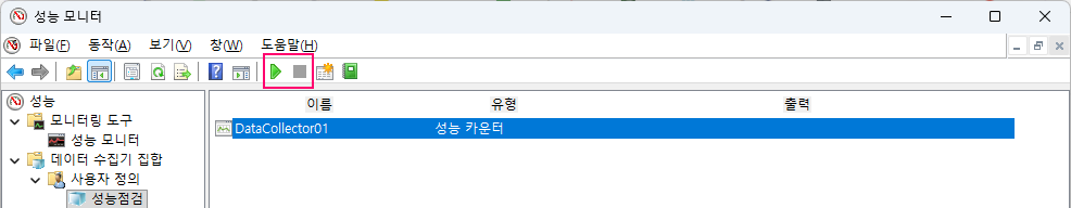 작성한 성능 카운터를 선택하면 상단에 시작 및 중지 아이콘이 나타나는데 이것으로 로깅의 시작 및 중지를 지시할 수 있다. 로그를 확인하려면 작업 중지 후 수행한다.