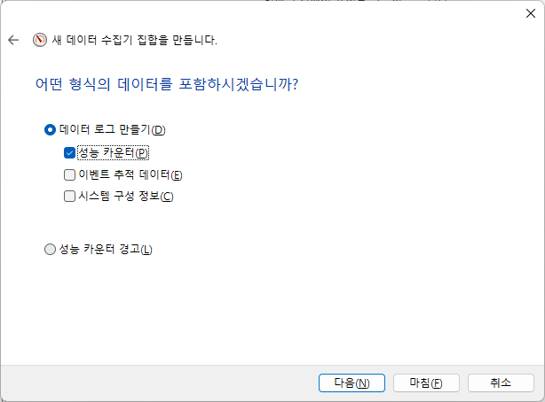 위의 그림처럼 데이터 로그 만들기 > 성능 카운터를 선택하고 [다음]을 누른다.