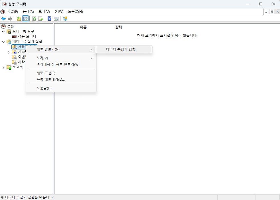 성능 모니터가 가동되면 데이터 수집기 집합 > 사용자 정의를 우측 마우스를 클릭하고 새로 만들기 > 데이터 수집기 집합을 선택한다.