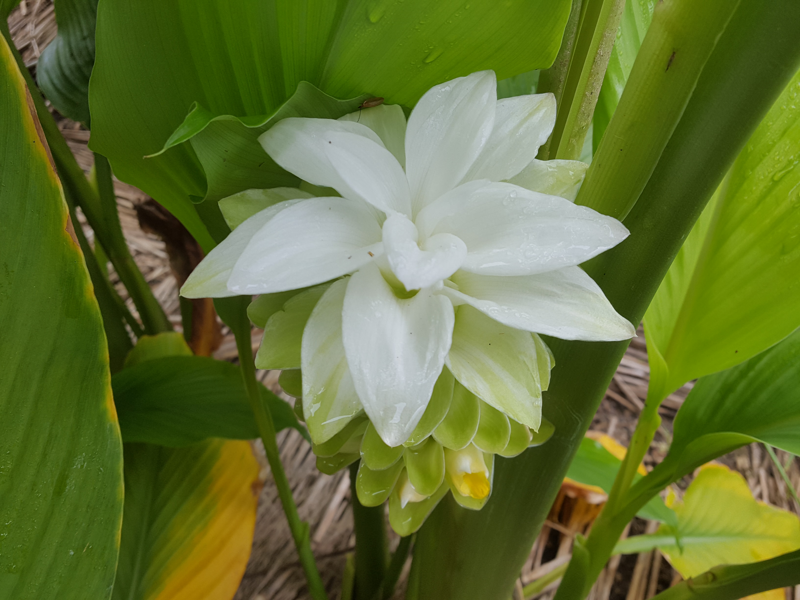 텃밭에 심은 강황이 올해는 비가 많이 오고 기온이 높아서인지 성장이 아주 좋다. 거의 밀림 수준이다. 참 좋다 하며 지나는데 잎겨드랑이에 하얀 꽃이 달렸다. 강황의 모근으로 몇 년째 재배를 이어오고 있는데 꽃을 보기는 처음이다.