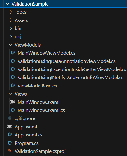 ValidationSample은 MVVM(Models, Views, View Models) 패턴으로 개발 시 입력항목에 대한 검증과 검증 오류 출력이 필요한 경우 참조할만한 예제이다. 예제는 이메일 항목에 대한 검증과 오류 출력을 세 가지 형태로 제시하고 있다. 세 가지 뷰모델은 Reactive UI 프레임워크의 ReactiveObject를 상속받아서 작성되었다.