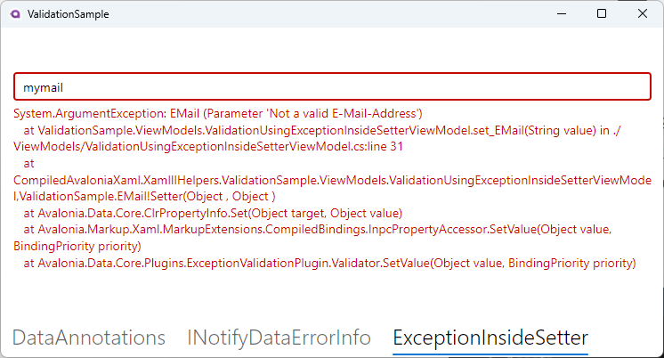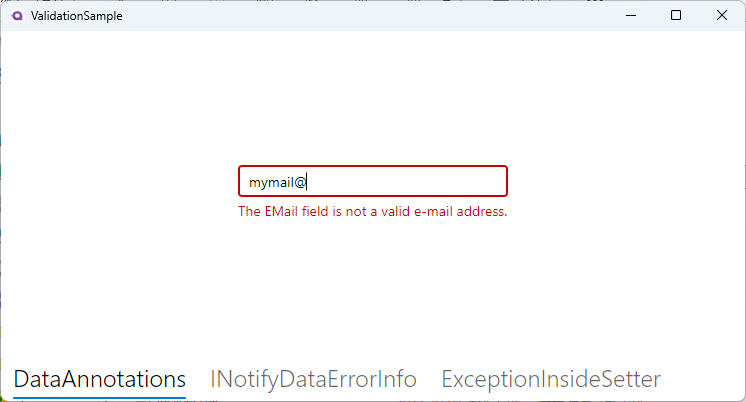 <TextBox Text="{Binding ValidationUsingExceptionInsideSetterViewModel.EMail}" />