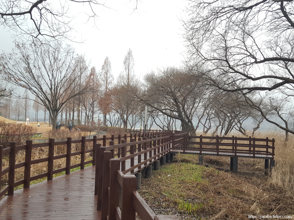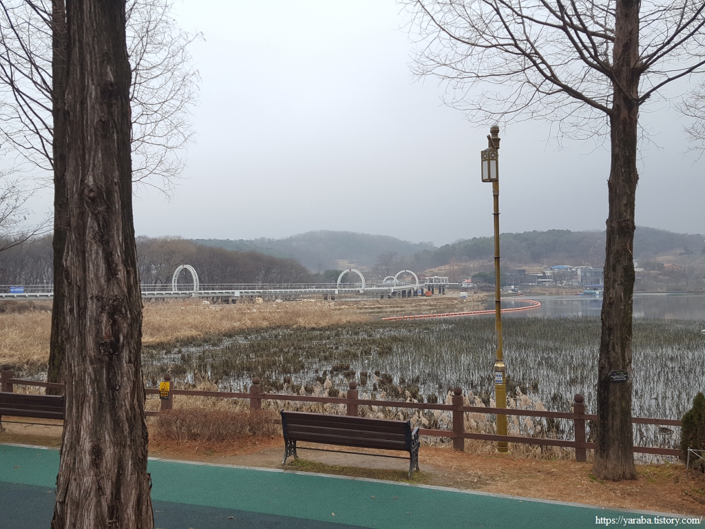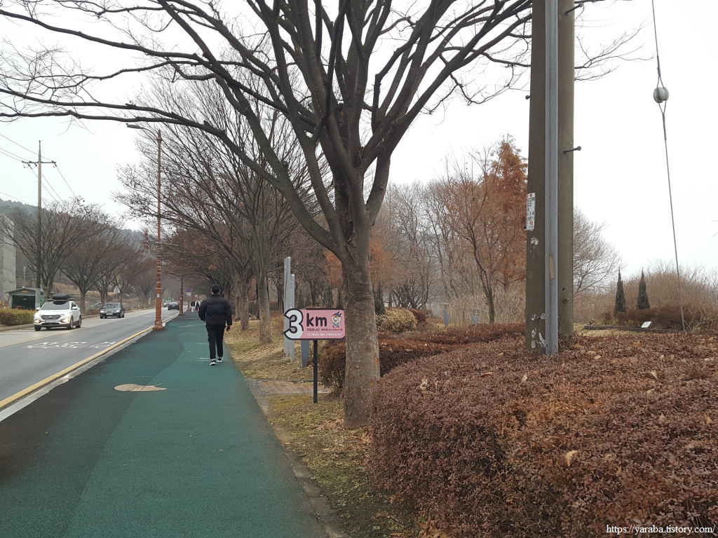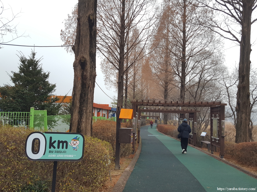 깔끔하게 조성되어 있는 호수 둘레길은 약 4.8Km 정도이므로 가볍게 걸을 수 있는 길이다. 그래도 겨울임에도 중간부터는 외투를 벗어서 들고 걸어야 했다. 남쪽을 향해서 시계 방향으로 걸으면 호수 둘레길에 세워진 거리 표식과 함께 걷게 된다. 시작은 메타세쿼이아 산책길이다.