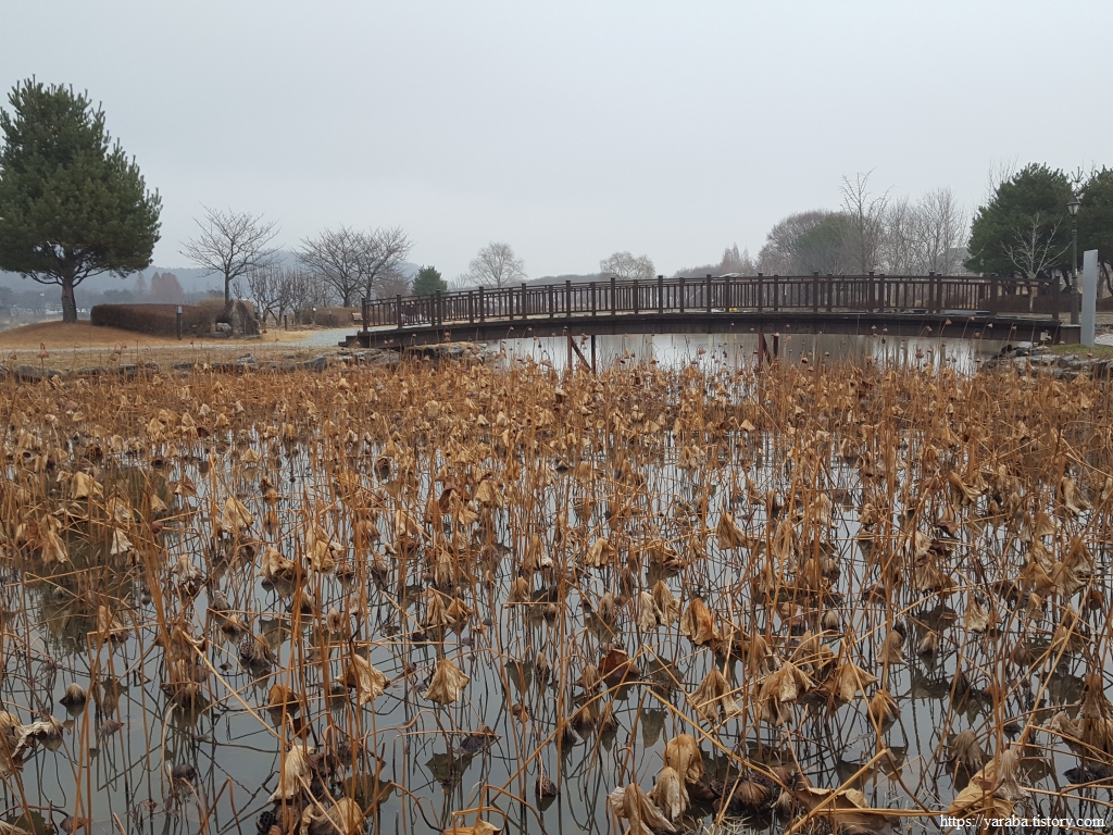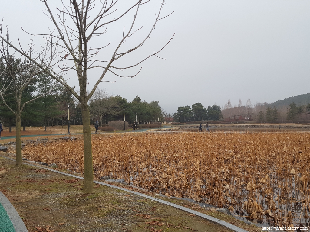 계절을 따라서 잎을 모두 떨군 연밭과 함께 호수 남쪽 끝자락을 돌아간다. 연잎은 모두 노랗게 지고 한편으로는 황량해 보이지만 물속에서는 봄에 새로운 줄기를 뽑아낼 연 줄기와 연 씨앗들이 곤히 잠들어 있다고 생각하면 생명력이 뿜뿜 하는 활력이 넘치는 공간이라는 시각도 생긴다.