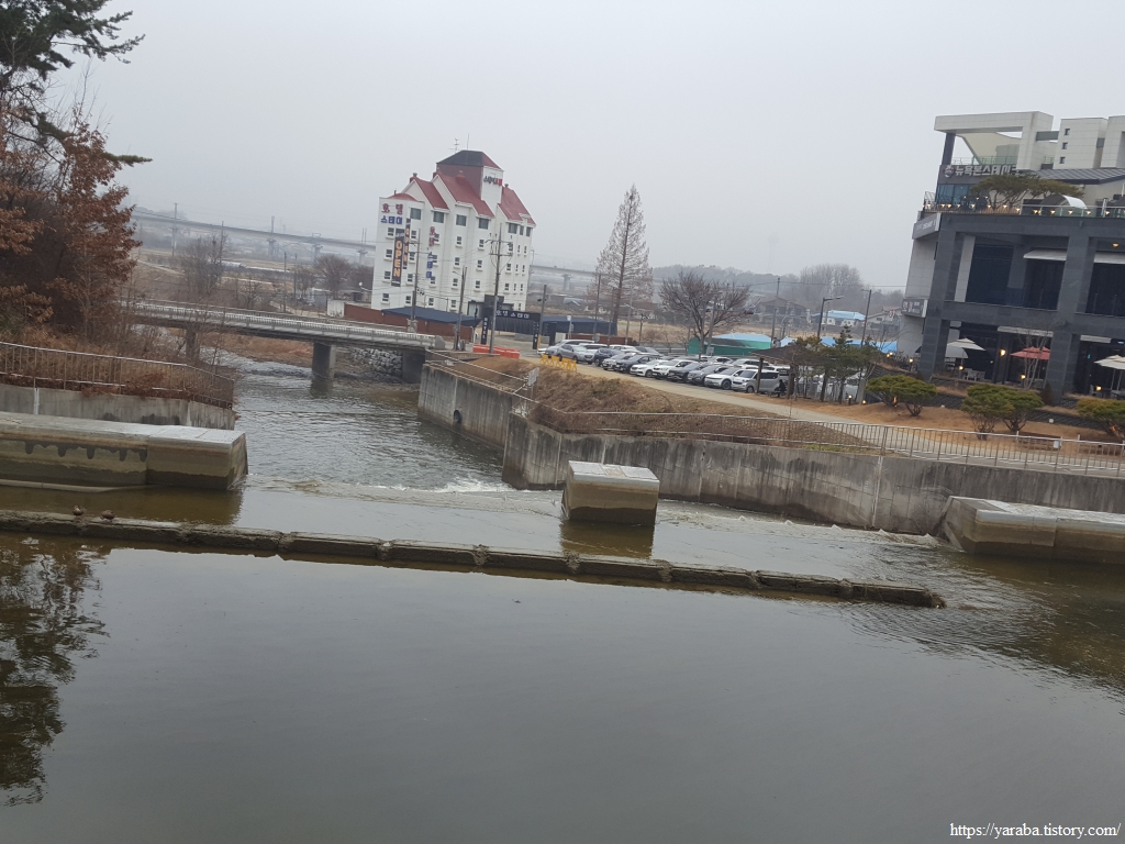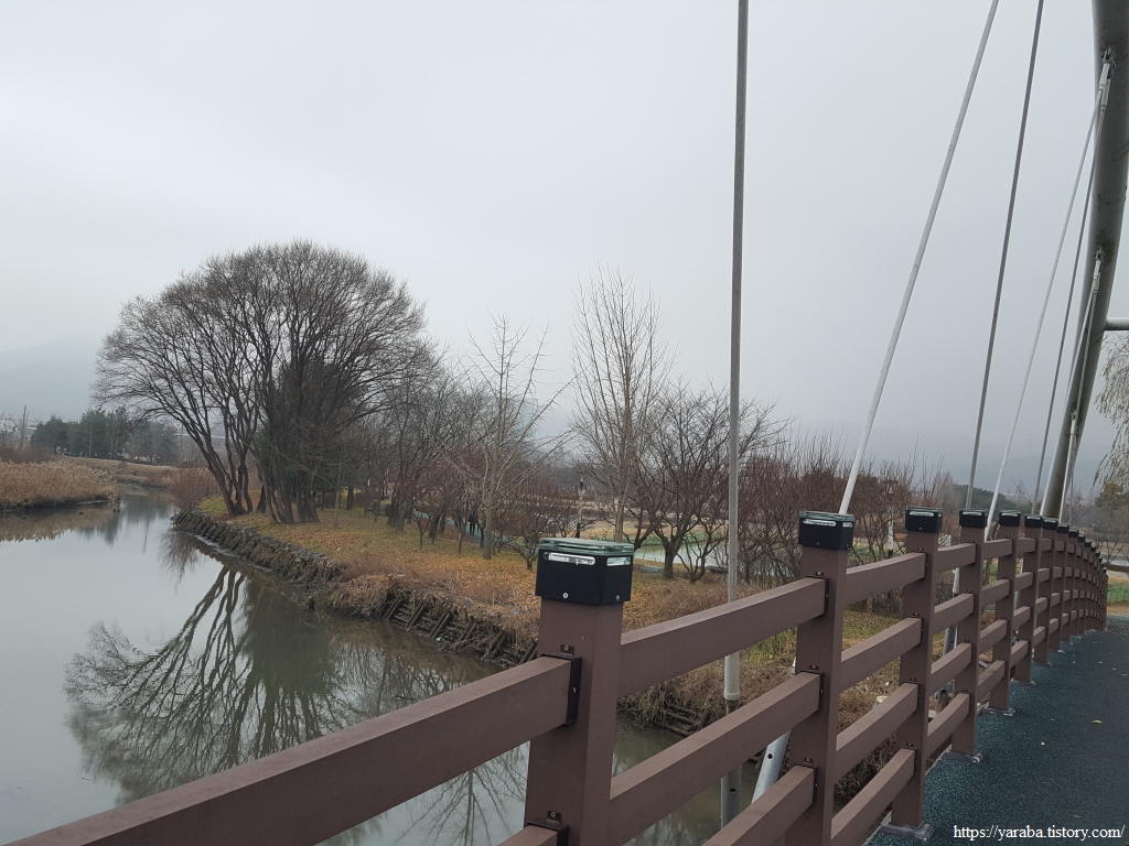 호수 중간까지 내려가면 호수를 가로지르는 다리를 한창 만들고 있었다. 신정호 생태 관찰 교량이라고 한다. 산책길도 호수로 들어가는 작은 하천을 건너서 길을 이어간다.