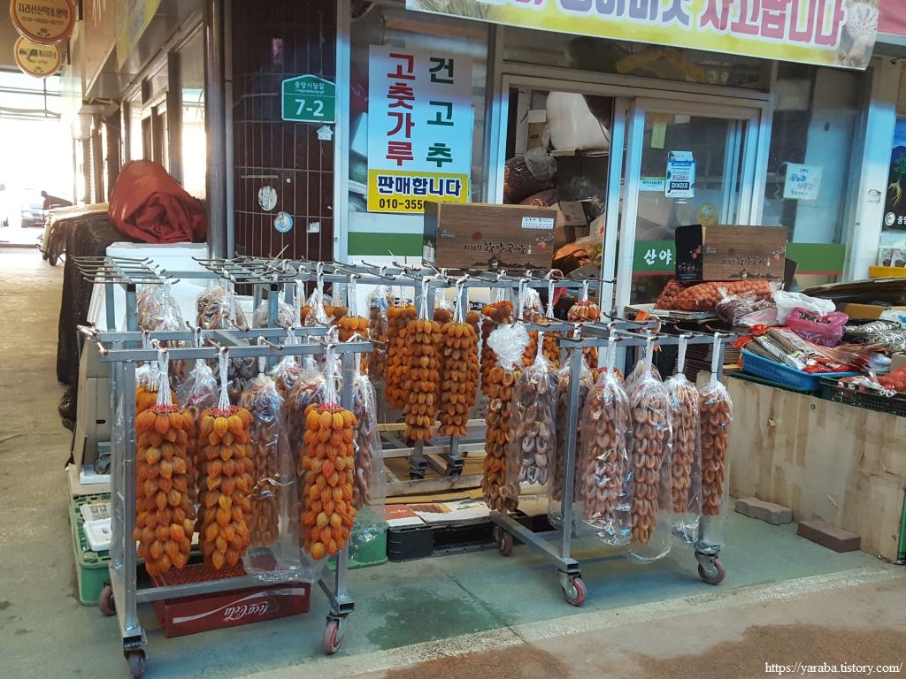 어제까지만 해도 함양 시내는 전지훈련으로 내려온 청소년 운동선수들 때문에 남는 방이 없었는데 오늘은 모두들 돌아가고 다행히 묵을 수 있는 방을 구할 수 있었다. 숙소를 잡고 주변 시장도 구경하는데 함양 전통도 "지리산"이 주인공이다. 주렁주렁 매달린 곶감을 구경하는데 옆지기가 곶감으로 치료 효과를 얻은 미국인 이야기를 해준다. 실제로 곶감은 기침, 가래, 설사 등을 치료하는 민간요법으로 쓰이기도 하지만 실제로 비타민 C과 비타민A가 풍부하다고 한다.