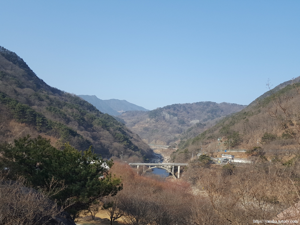 좌측으로는 법화산(993m), 우측으로는 와불산(1,214m)을 두면서 동북쪽으로 계곡을 빠져나가는 모양새다. 뒤로는 용유담 위로 임천을 가로지르는 용유교가 계곡 사이를 이어주고 있다.